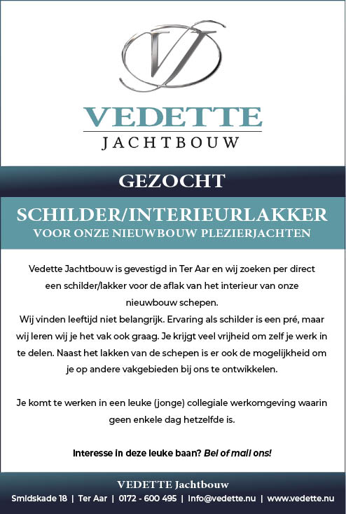 Vedette Jachtbouw is gevestigd in Ter Aar en wij zoeken per direct een schilder/lakker voor de aflak van het interieur van onze nieuwbouw schepen. Wij vinden leeftijd niet belangrijk. Ervaring als schilder is een pré, maar wij leren je het vak ook graag. Je krijgt veel vrijheid om zelf je werk in te delen. Naast het lakken van de schepen is er ook de mogelijkheid om je op andere vakgebieden bij ons te ontwikkelen.